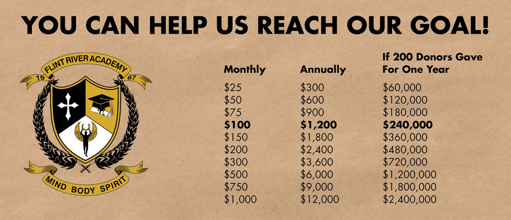 Please make checks payable to Flint River Academy. Contributions may be mailed to the attention of: